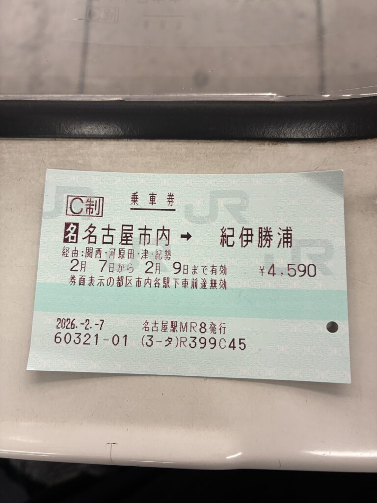 私の場合、今回は名古屋から紀伊勝浦までという切符を1枚買いました。これ1枚あれば、途中の松阪駅に降りて一晩泊まっても、切符は無効にならず、次の日もまたその続きから乗れるんです。